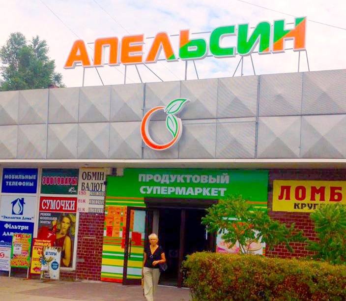 Внешнее и внутреннее оформление продуктового супермаркета Апельсин.